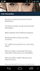 Whether you're simply looking to use a Cheesy or insulting chat up line to earn a slap in the face and the hilarity of your buddies, or a genuinely romantic phrase to woo the boy or girl of your dreams 101 will see you right. And then takes the flirty app idea further by Recognising different occasions such as "first Contact" or "Going Further" and feeding you the appropriate chat up lines for that particular situation.