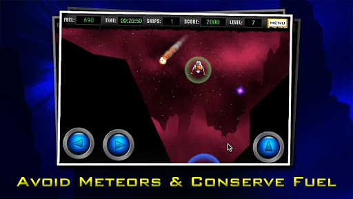 This here app we got for review today is Deep Space Lander . It's a new app on Google Play. Fly and navigate a spaceship to collect the purple orbs needed to unlock the landing pad. You have limited fuel and using your shield uses up some fuel. The shield is used to protect you from meteors/asteroids and is temporary. You will have to wait 20 seconds before using the shield again. A warning will come up when an asteroid is close (sometimes the warning comes too late or I'm just too slow to react and press the shield). Once in a while there is no hope as the commit hits your ship right after the warning signal. This occurs more often when you are towards the top of the screen and don't have a great view above you to see that a rock is coming. I guess that's how to play and an introduction up in one besides the thruster button. The graphics and user interface/menu are really well done. Details are pixel smooth, no pixels apparent.